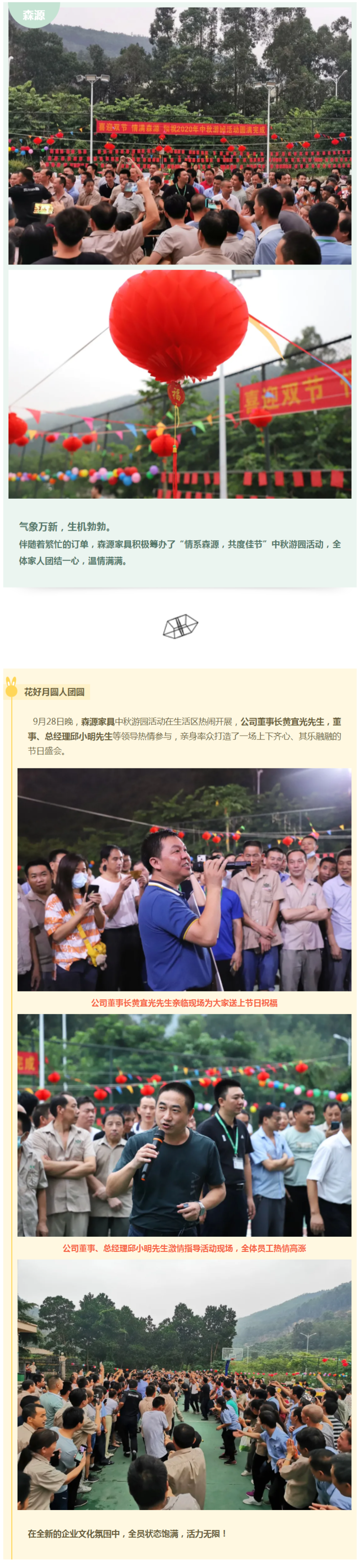9月28日晚,森源家具中秋游園活動在生活區熱鬧開展,公司董事長黃宜光先生,董事、總經理邱小明先生等領導熱情參與,親身率眾打造了一場上下齊心、其樂融融的節日盛會。