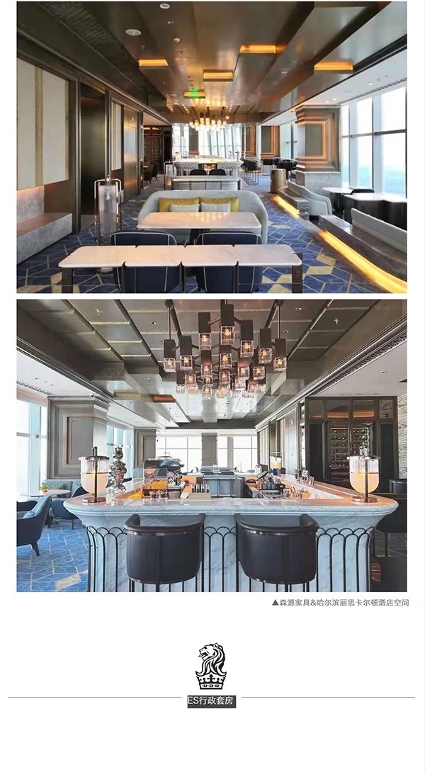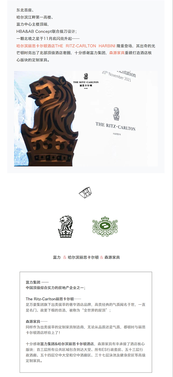 十分感謝富力集團&哈爾濱麗思卡爾頓酒店,森源家具有幸承接了酒店核心版塊:首三層所有公共區域包含到達大堂、所有ES行政套房、五十三層行政酒廊、五十四層空中大堂和空中酒廊區、三十七層泳池及健身房區等**定制家具。