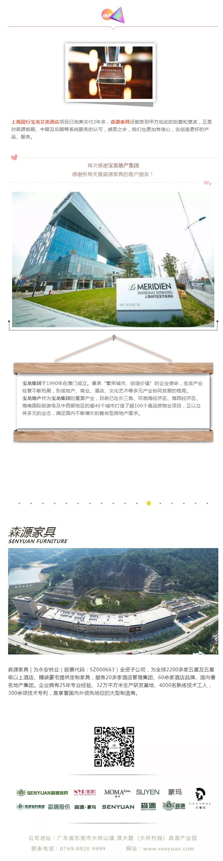 森源家具緣起上海閔行寶龍艾美酒店的精品品質與服務,從寶龍集團近1200家戰略供應商庫中評出,